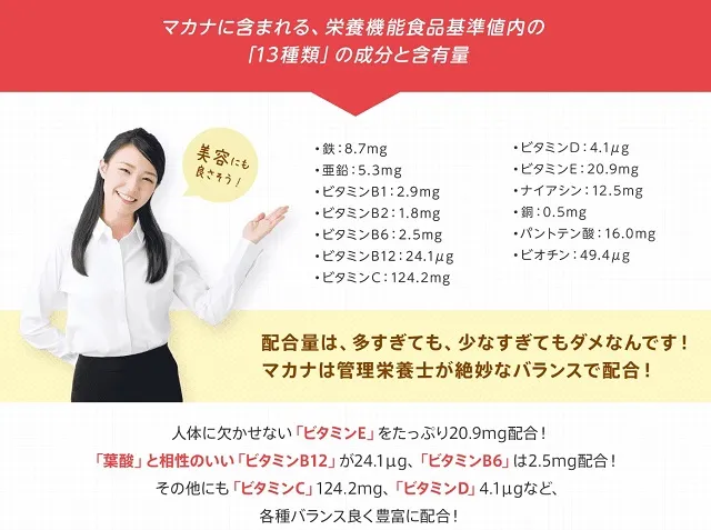 マカナ葉酸サプリには、29種類のビタミン・ミネラルが配合されています。しかも、その中でもビタミン10種類が、栄養機能食品基準値内の含有量を達成。