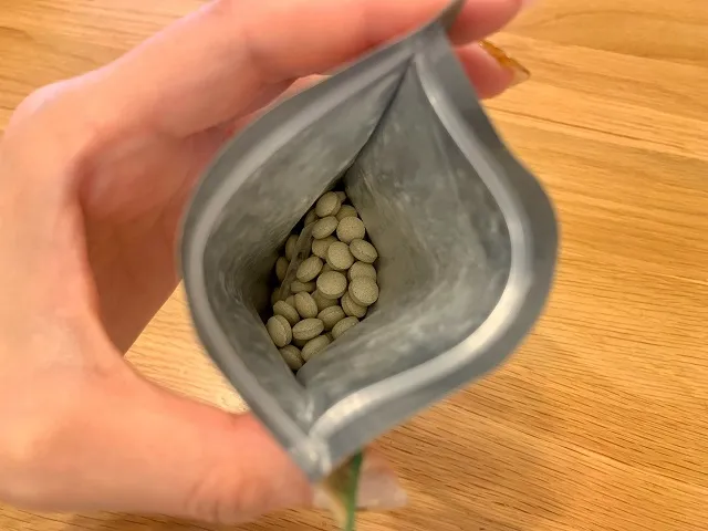 パウチを開けてみると、白っぽい錠剤が入っており、わずかに独特なニオイがしました。野菜の粉のようなニオイで、スピルリナのニオイだと思います。