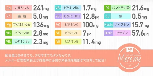 現役の産婦人科医と管理栄養士が監修しているメルミー葉酸サプリには、葉酸のほかにも、鉄分、カルシウムなど14種類の栄養素が栄養機能食品基準値内で配合されています。